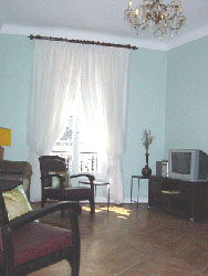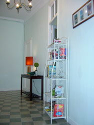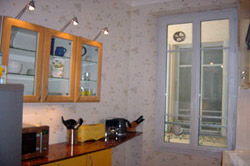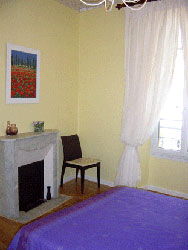 Further along the entrance hall is the lounge with an original marble fireplace, wooden parquet flooring and a splendid antique chandelier. It has tall windows giving the same views as Bedroom One. There is a beautiful Moroccan hand-carved sofa which seats two, 2 leather easychairs, and dining table and chairs. There is a CD/cassette player/radio, and a television, should you have time to watch it. There is a DVD player, should you wish to bring your favourite movies with you. The apartment is what the French call ‘traversant' (running from the front of the building through to the back) so you have through air – very important on hot days and nights. The apartment has central heating should you ever need it. |