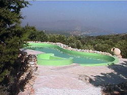 The villa is set in private gardens extending to an acre of olive trees. The private terraces surrounding the kidney-shaped pool, provide restful areas in both sun and shade. The adjoining, shallow splash pool with waterfall leading to the main pool is an inviting place for children to play or adults to cool down. |