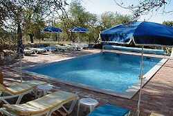 Patio doors lead onto the south facing private terrace with its own table, cushioned seating, cushioned reclining chairs, a barbeque and its own lemon tree to provide added shade. There is also a shared 10m x 5m swimming pool, set amidst trees and rocks. |